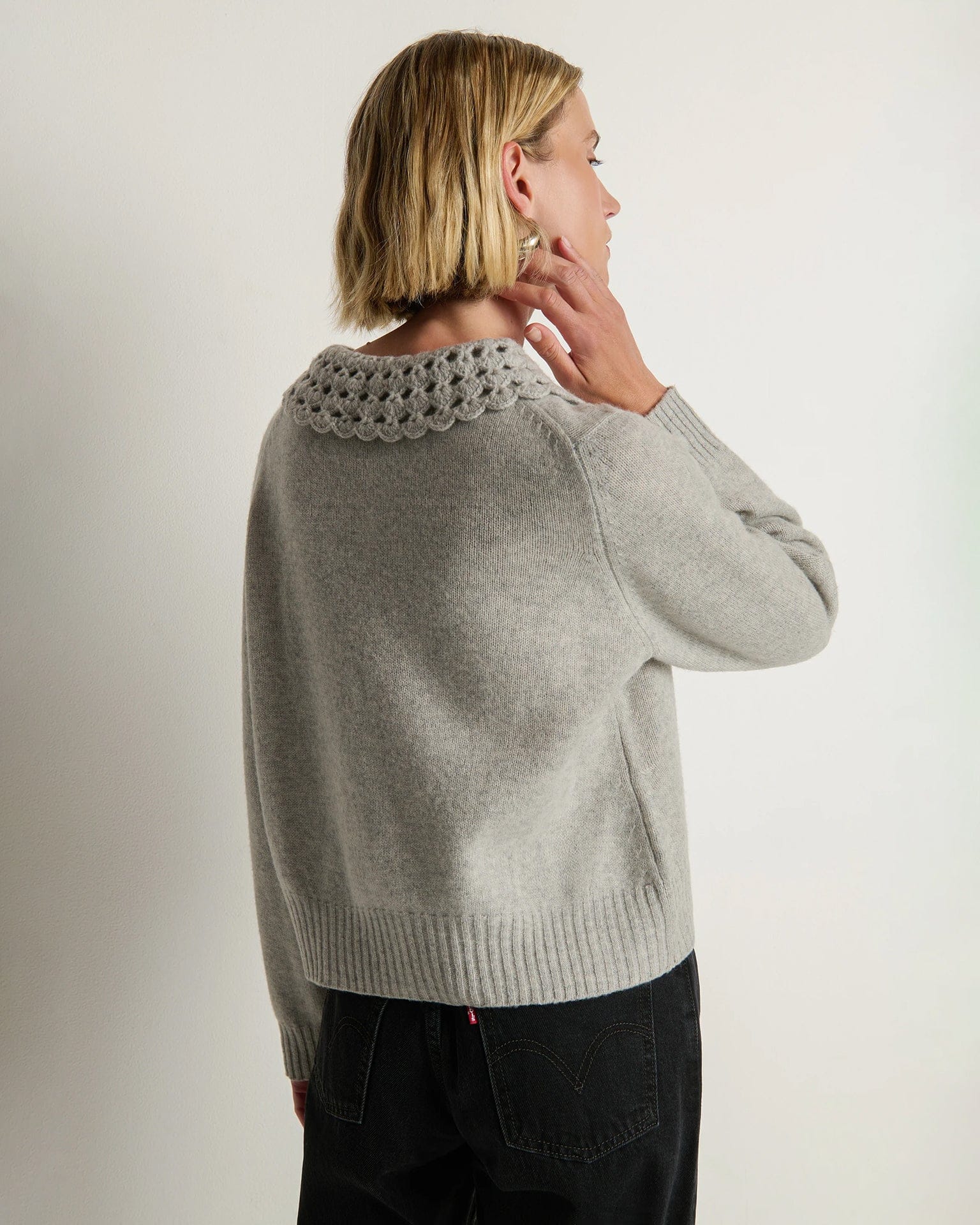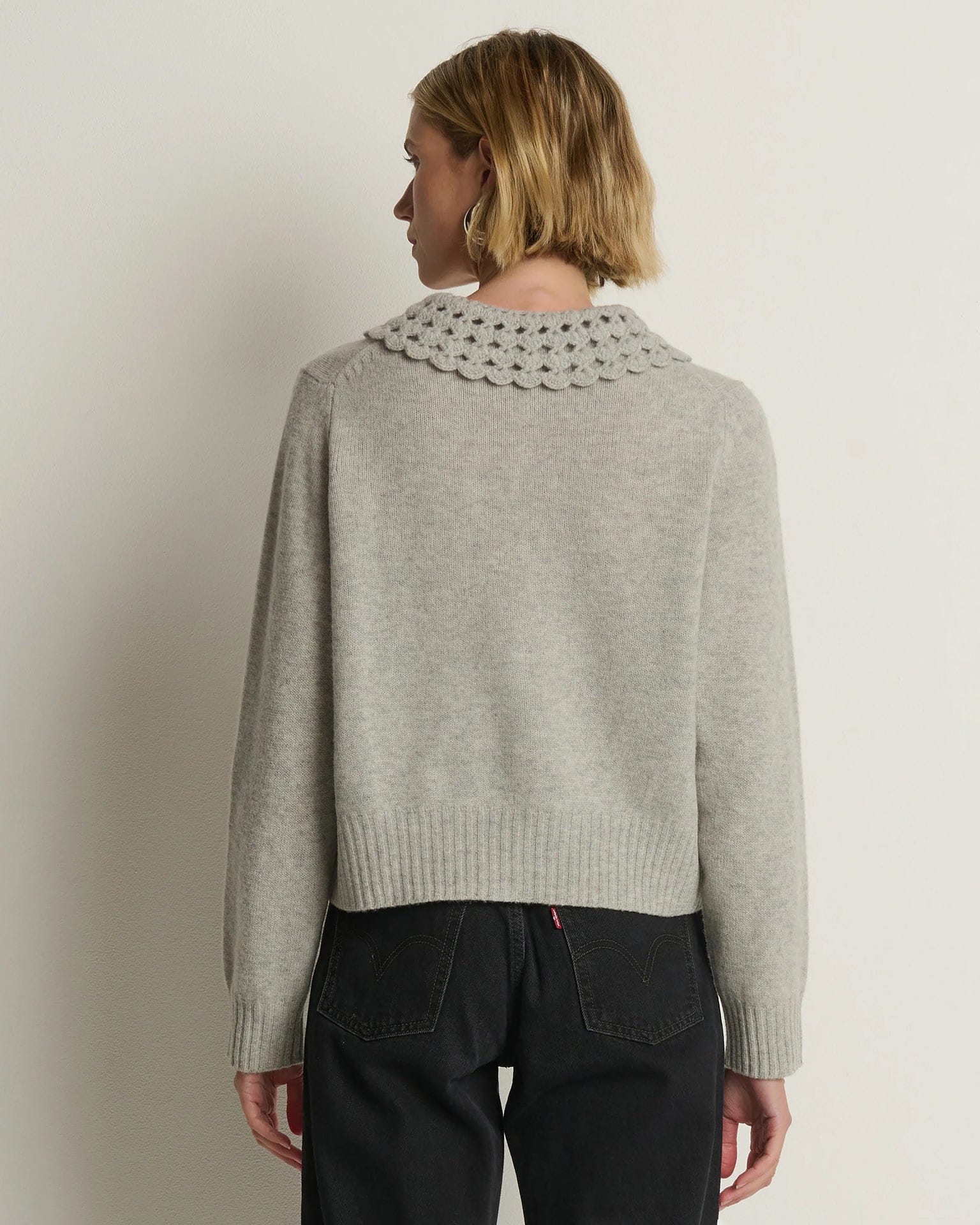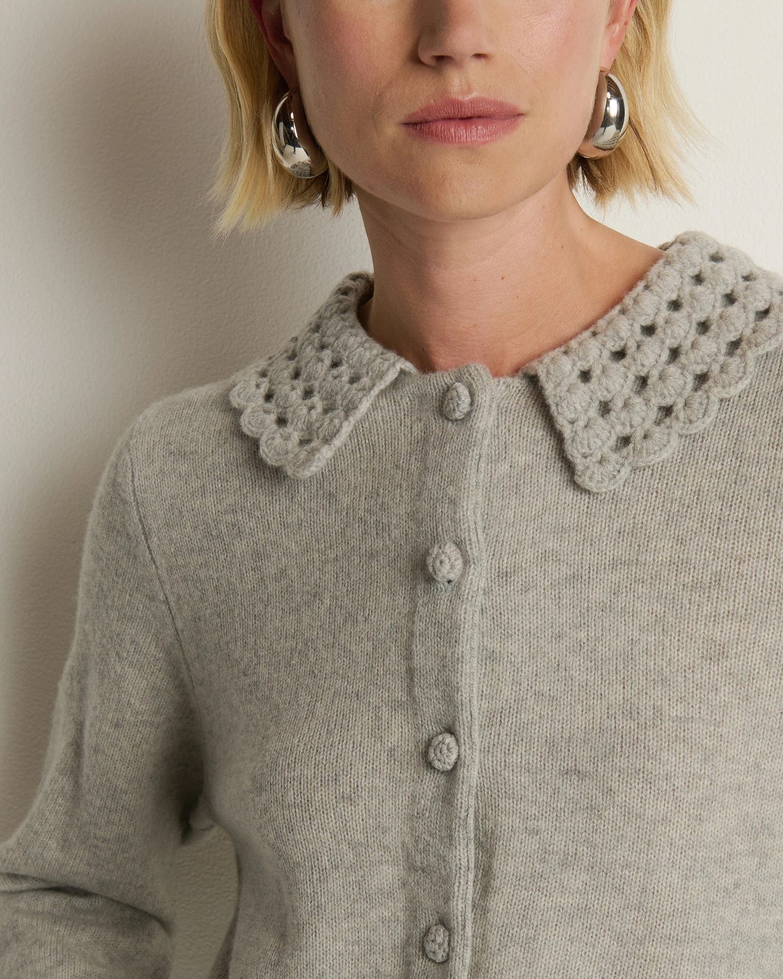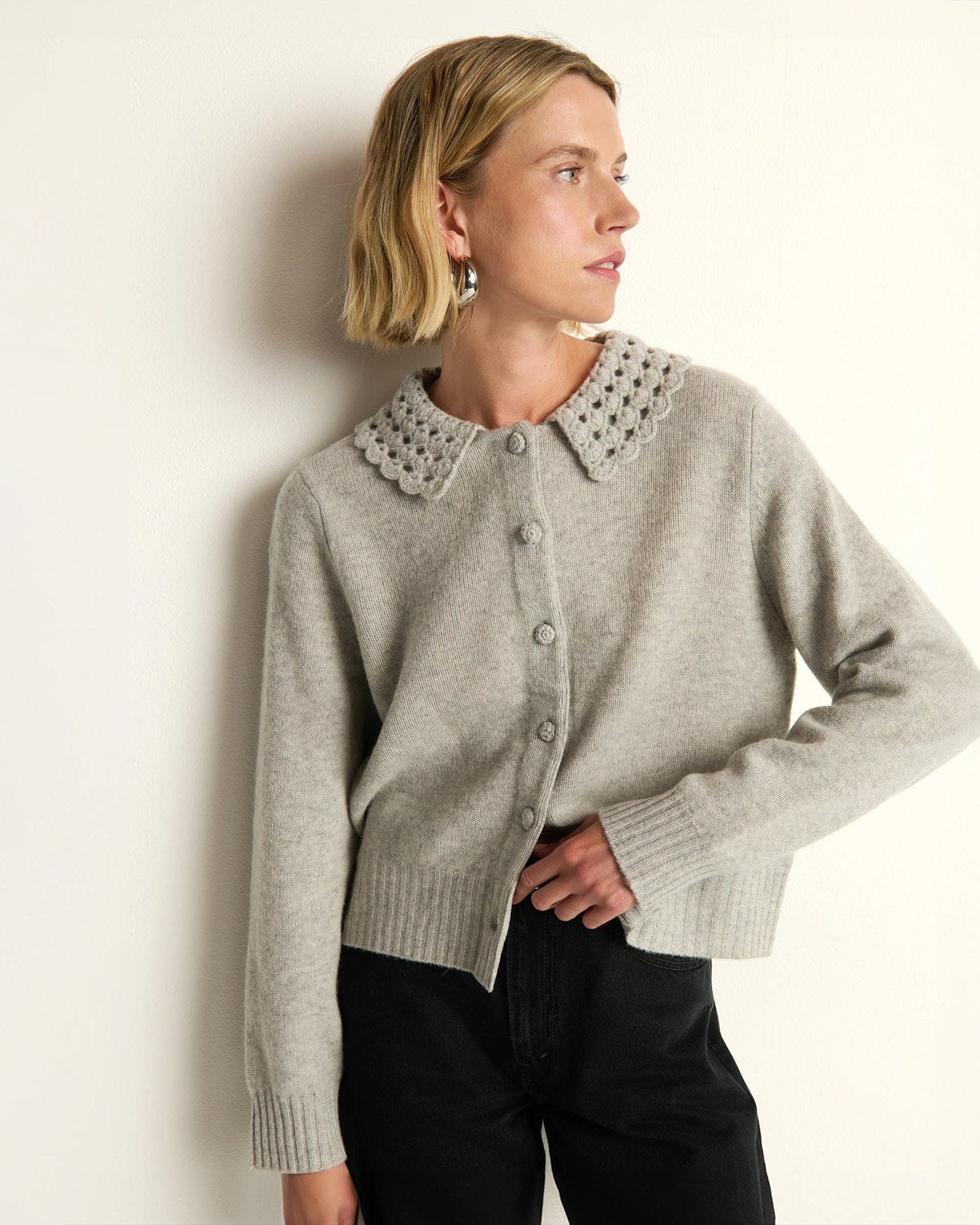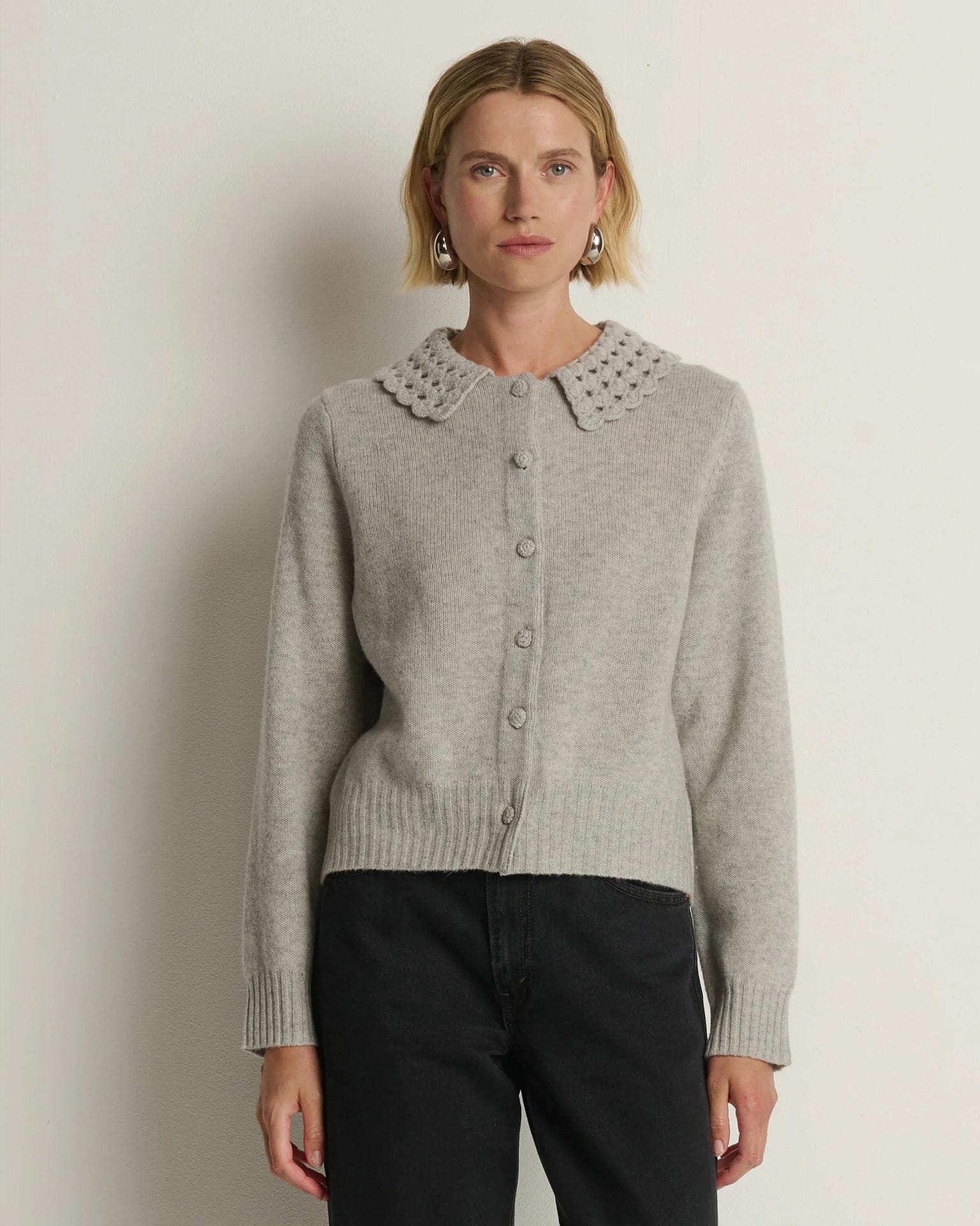 Nation's Addie Cardigan wraps soft texture in effortless style. Knit in soft and warm 100% merino wool, this button down cardigan features a relaxed fit. Its hand-crocheted Peter Pan collar and bishop sleeves bring subtle volume and refinement to a piece you can wear anywhere.
