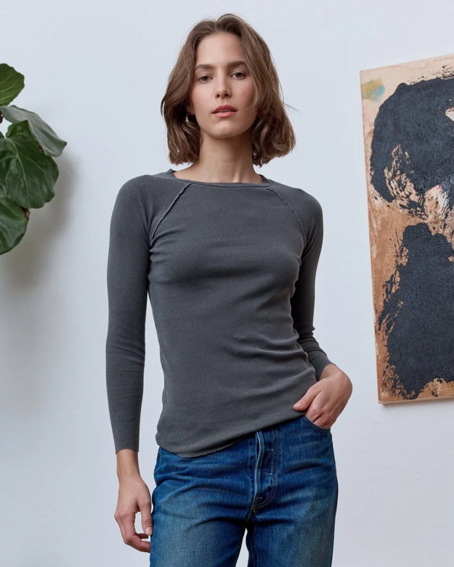 Meet your new favorite basic with perfectly elevated detailing. Aria from NSF is a flattering fitted crew with an exposed seam raglan shoulder, bracelet length sleeve, raw edges and an all over baby rib knit.