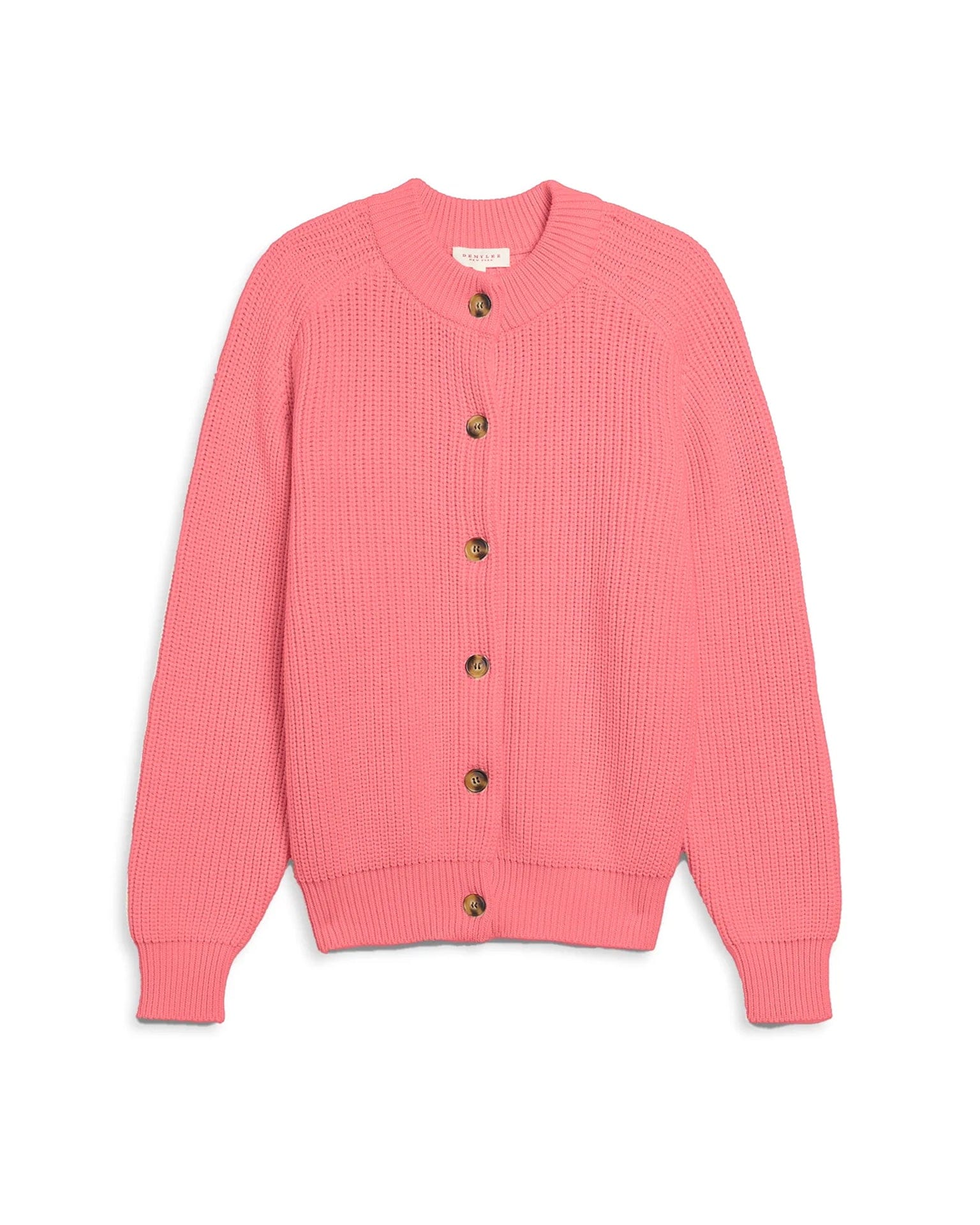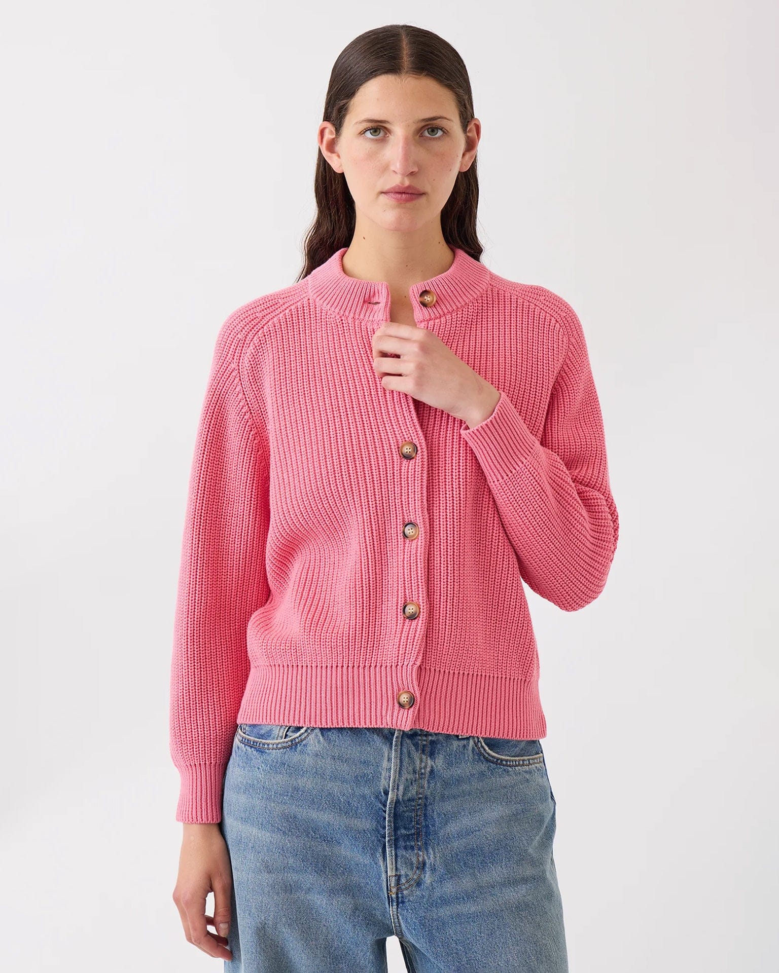 An easy cardigan, Audrey from Demylee is an all-over ribbed cardigan with a relaxed body in organic cotton. Featuring a high crew neckline, raglan sleeves, and light brown horn buttons, it's comfortable and put together all at once.