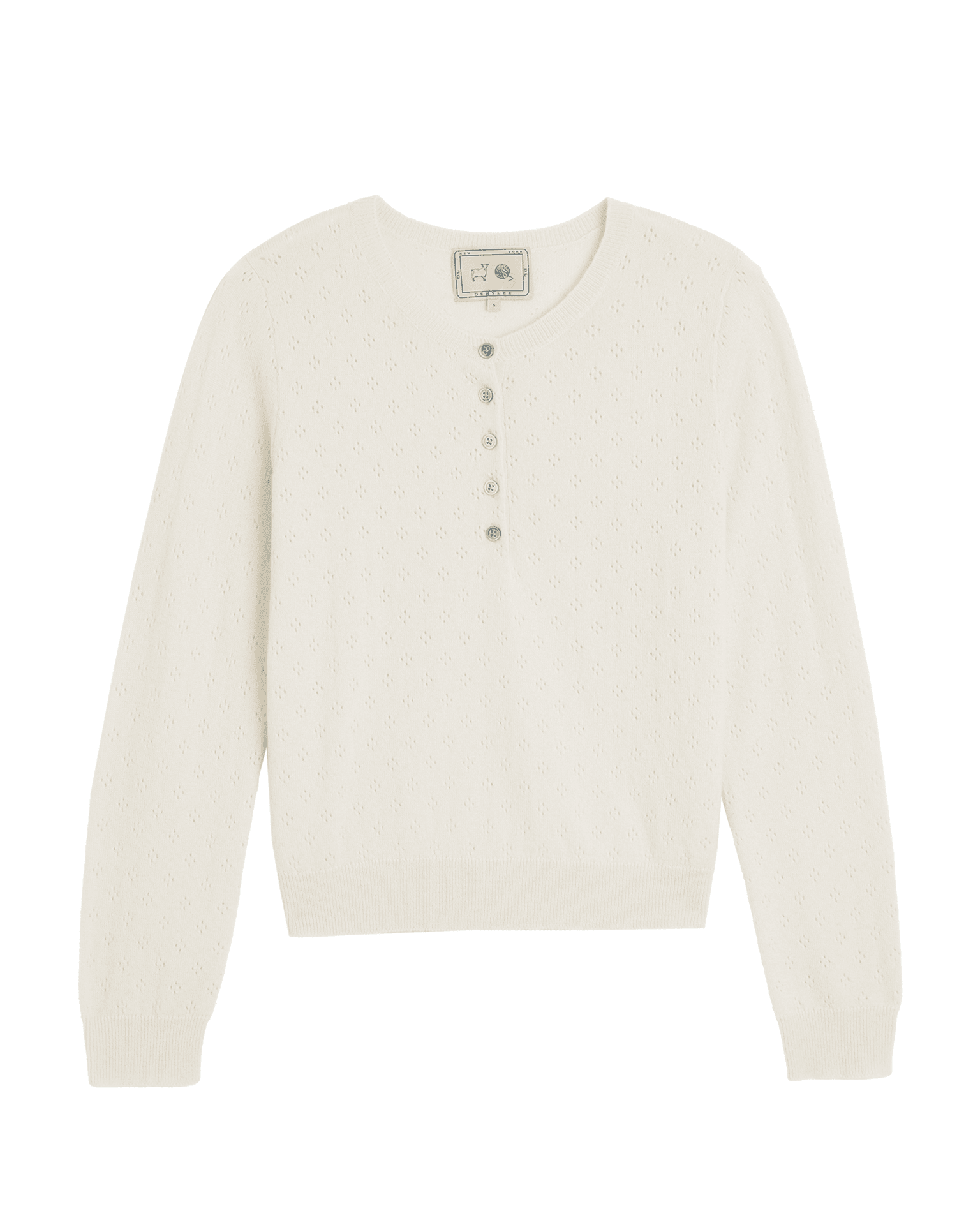 Avery is a sweet new silhouette for us from Demylee. Perfect for springtime, this long-sleeve henley features an allover pointelle knit and is made from a lightweight cashmere that's still easy to layer.