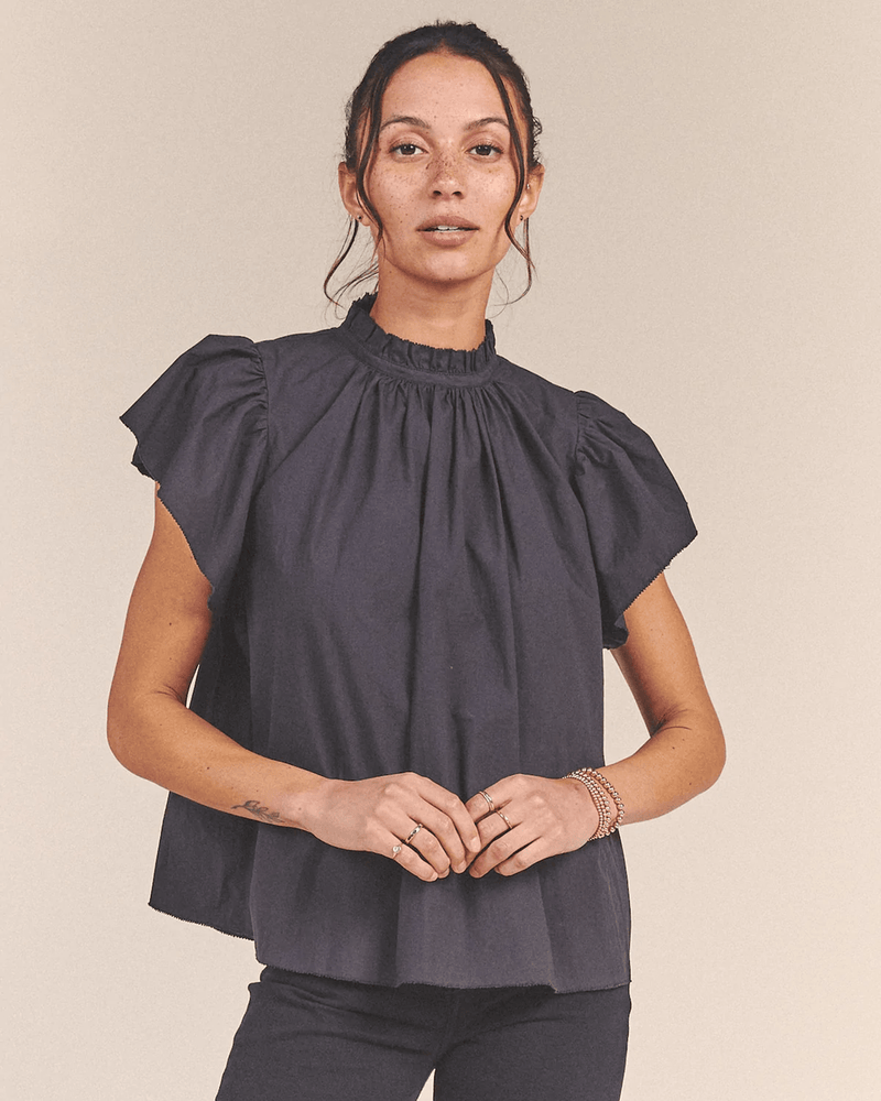 We love the ultra feminine Carla High Neck Blouse from Trovata. Both its high neck ruffled collar and wide ruffle sleeves feature a quaint trim detail along the hem lines that separate this blouse from the pack. With a relaxed A-line body and finished with a single back neck button, we love this sweet top paired with your favorite skinnies and beek.. clogs.