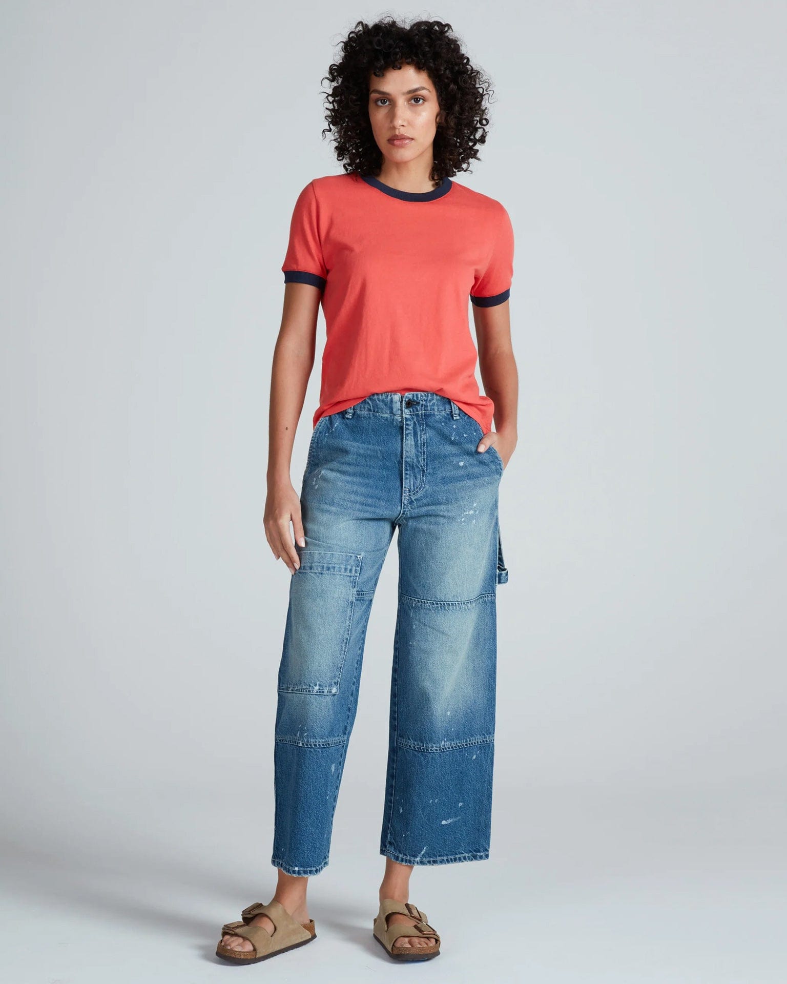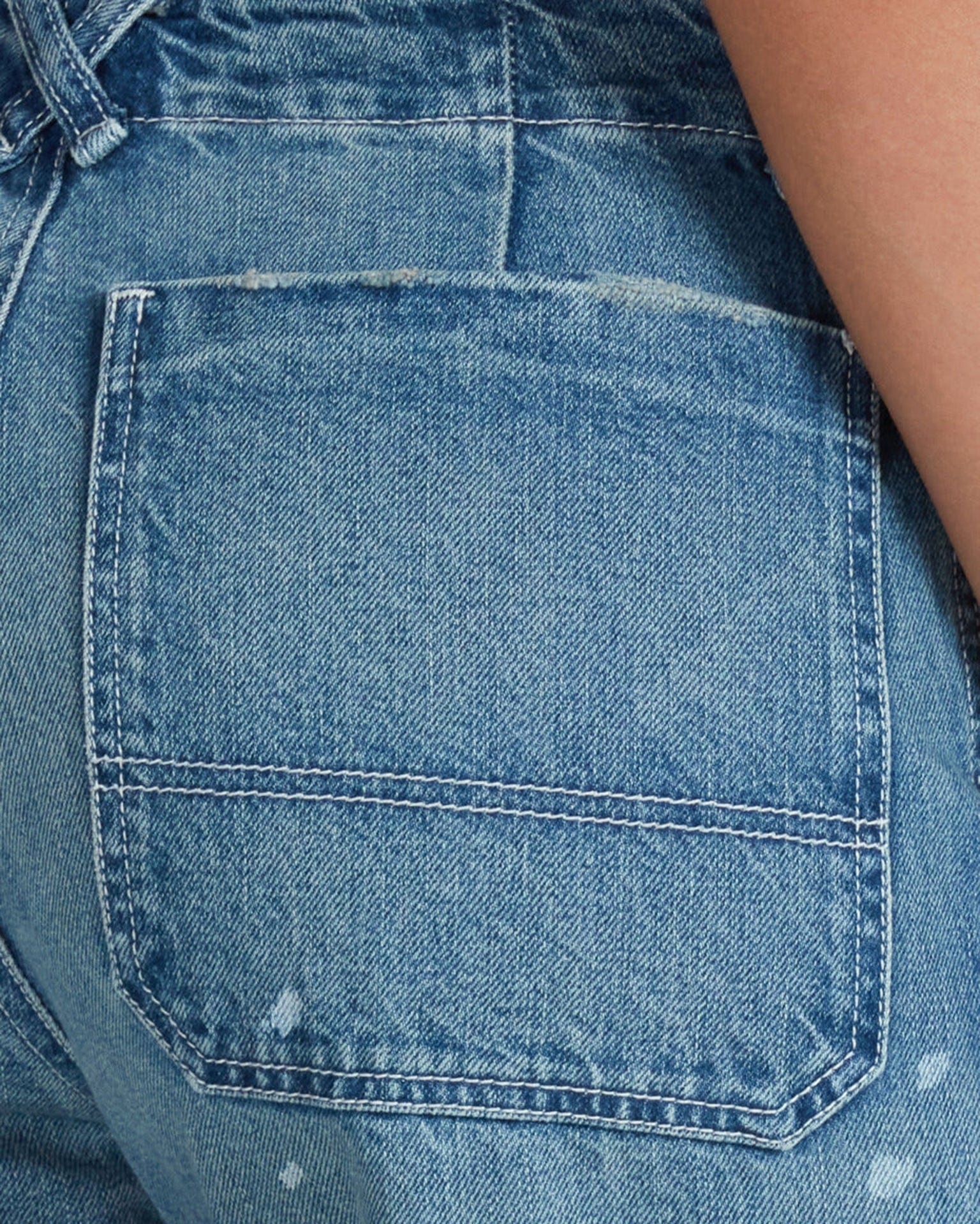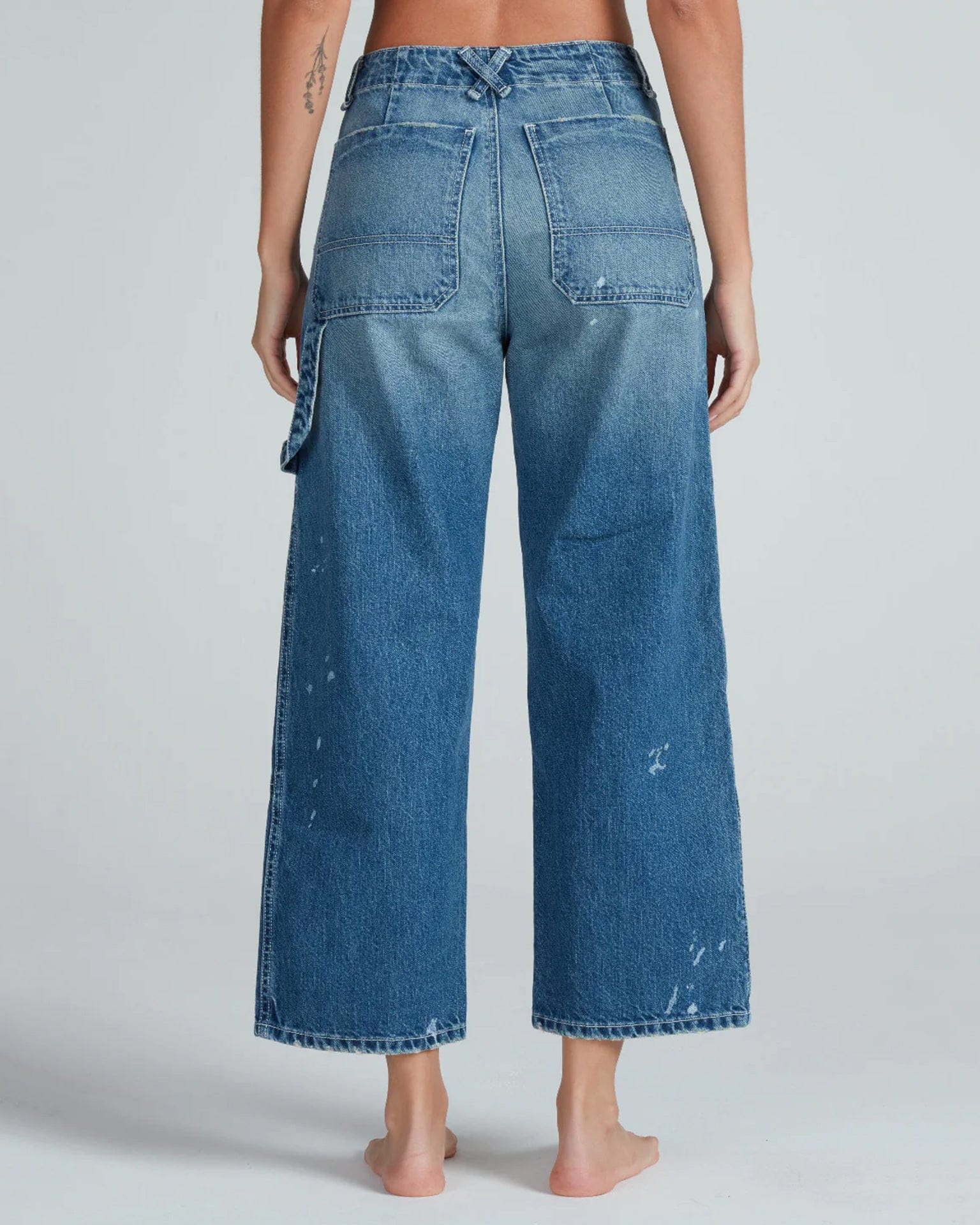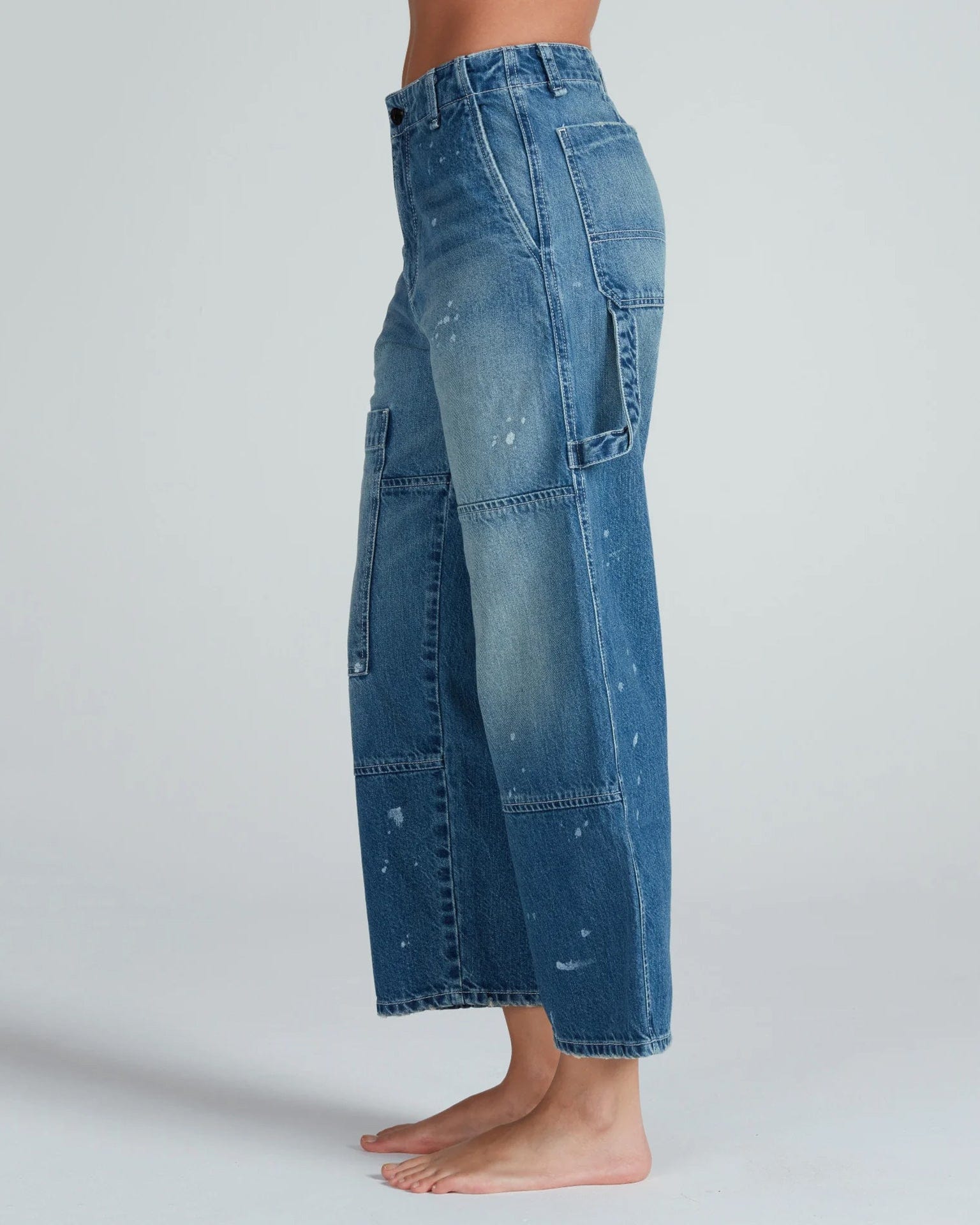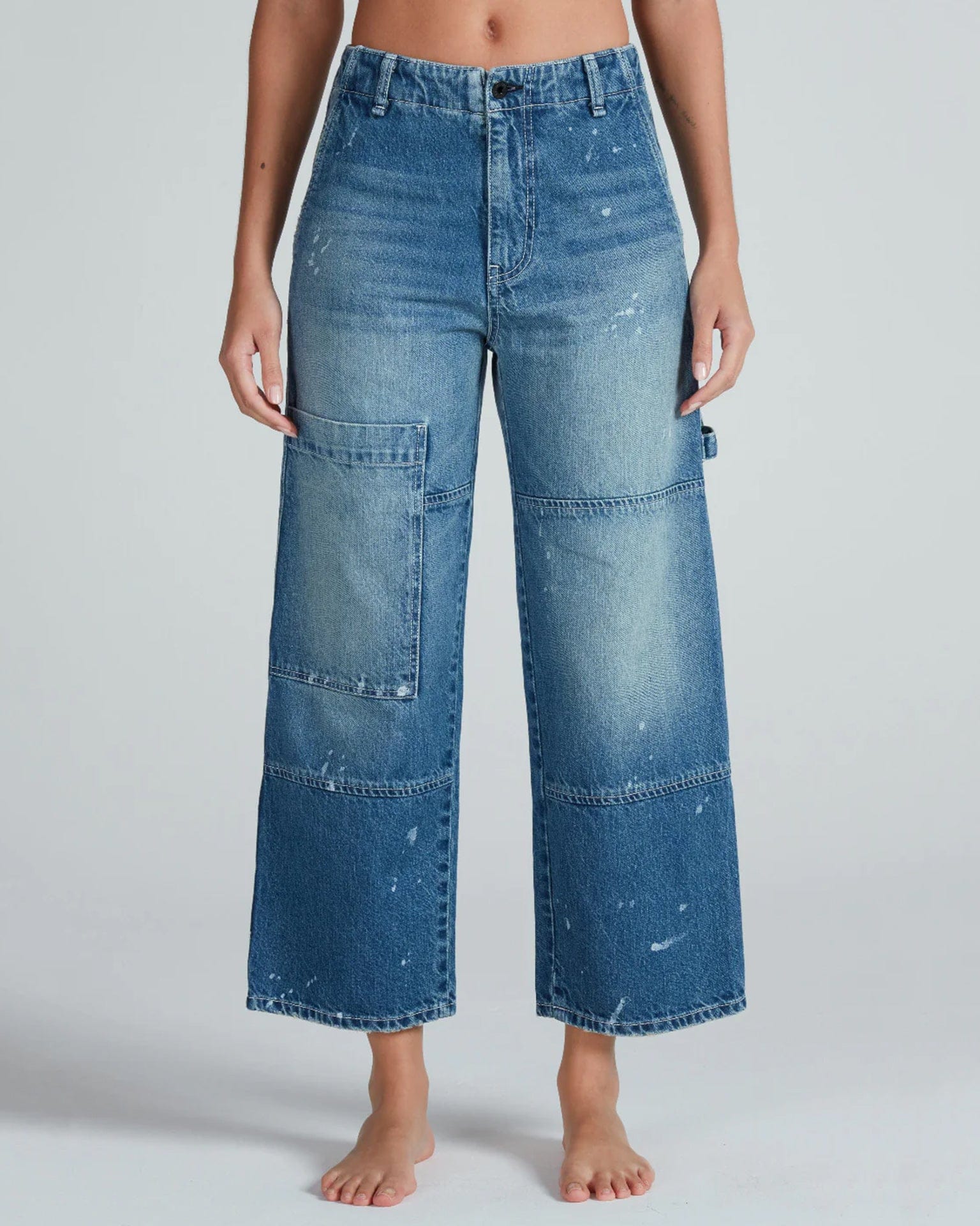 Carpenter Mammoth is a utility-inspired wide leg with a cropped, easy fit from ASKK NY. This cropped silhouette is crafted from 10 oz. rigid denim with vintage wash details and subtle paint splatters for a lived-in, worked-in feel. They feature oversized patch pockets, a hammer loop, and paneled construction for an authentic workwear look with a modern silhouette.