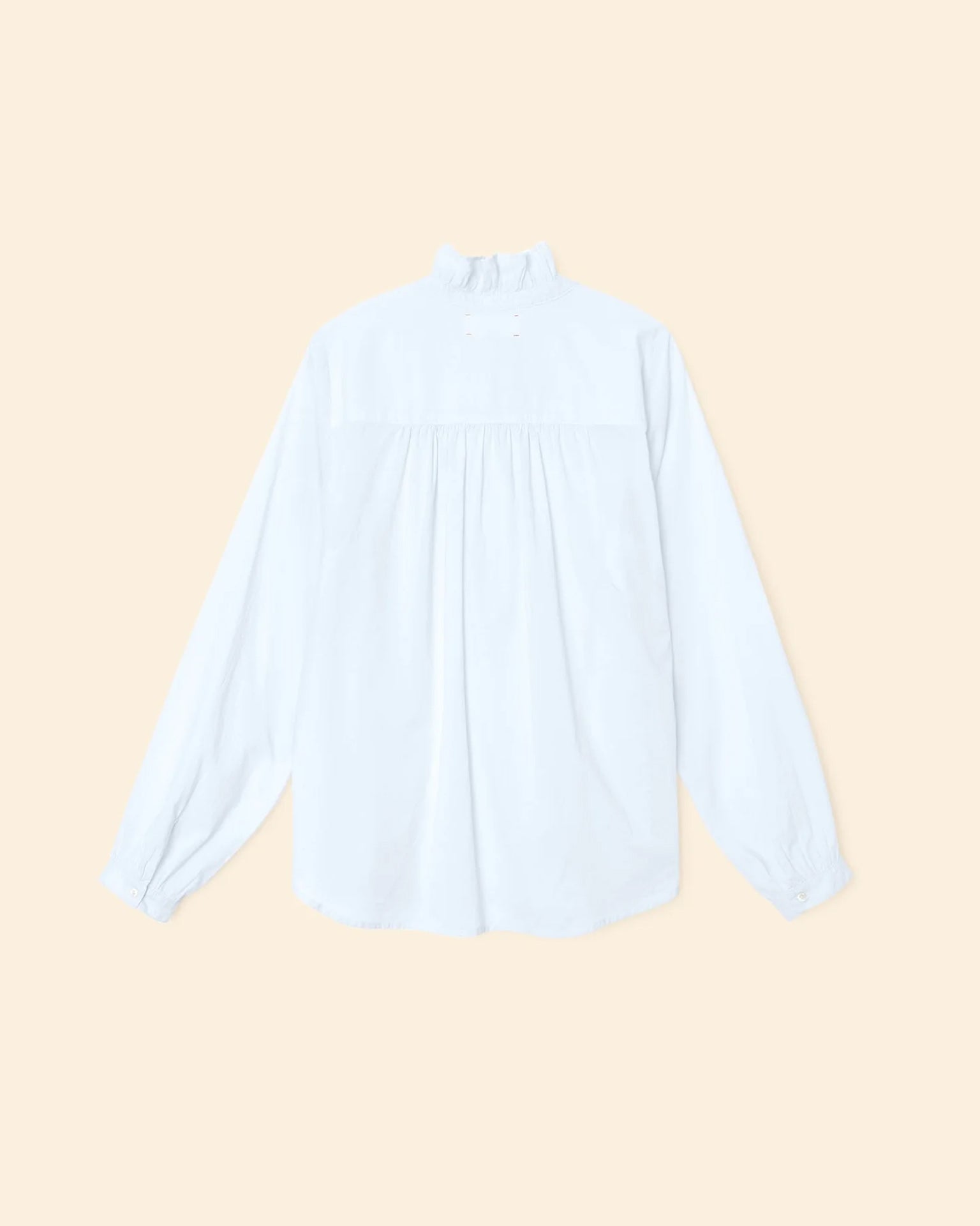 - Ruffle detailing around the neck and down the front placket