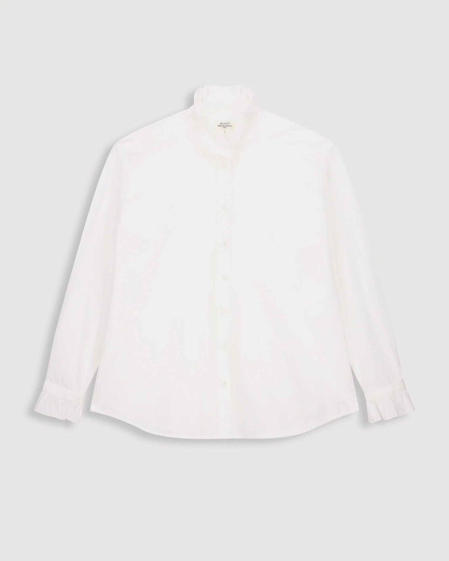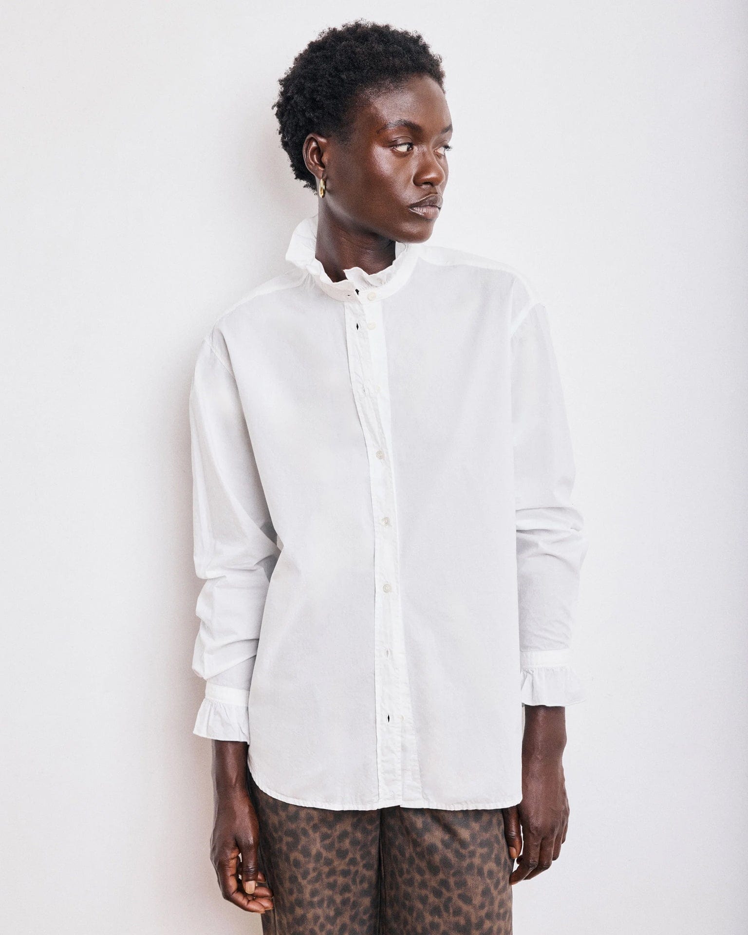 A new silhouette from Hartford, the Chana shirt revisits the bohemian spirit with a modern twist. Crafted in cotton poplin, its reimagined fit features a ruffled collar, slightly dropped armholes, tightened ruffled cuffs, lateral slits and liquette hem. A bold piece, pair it with straight or wide-leg pants for casual silhouettes.