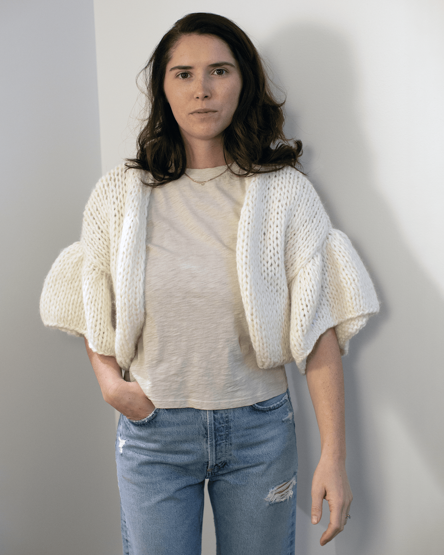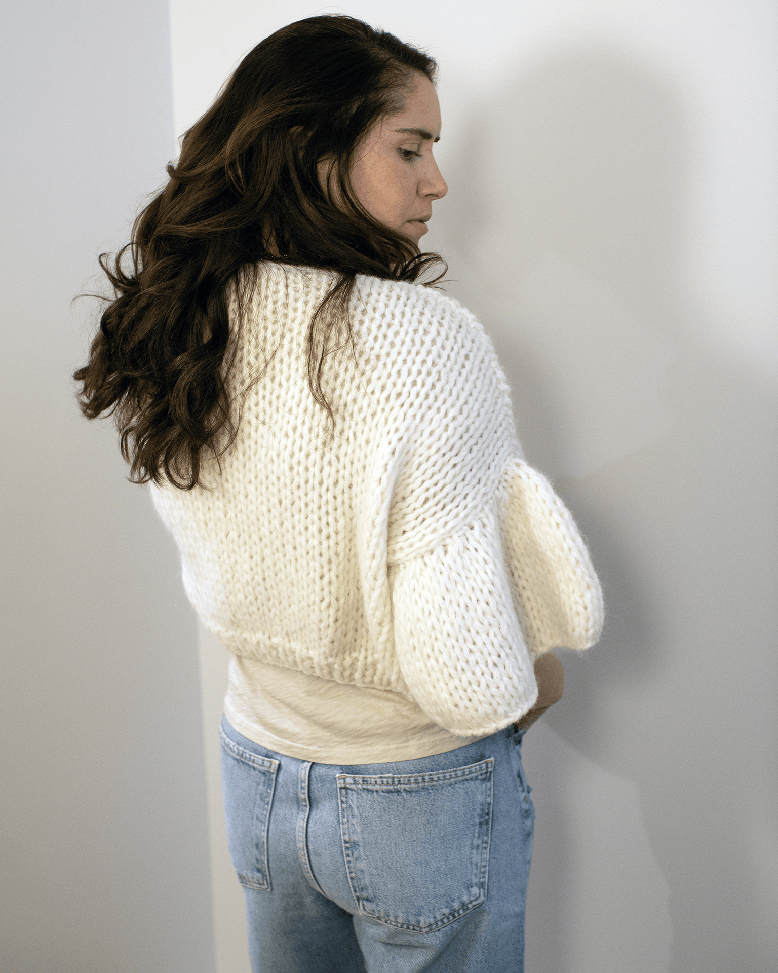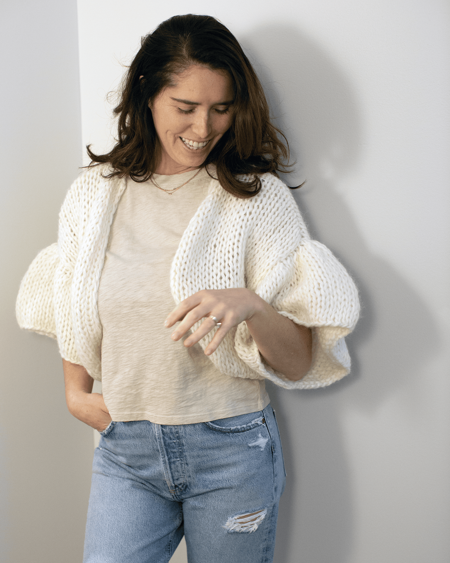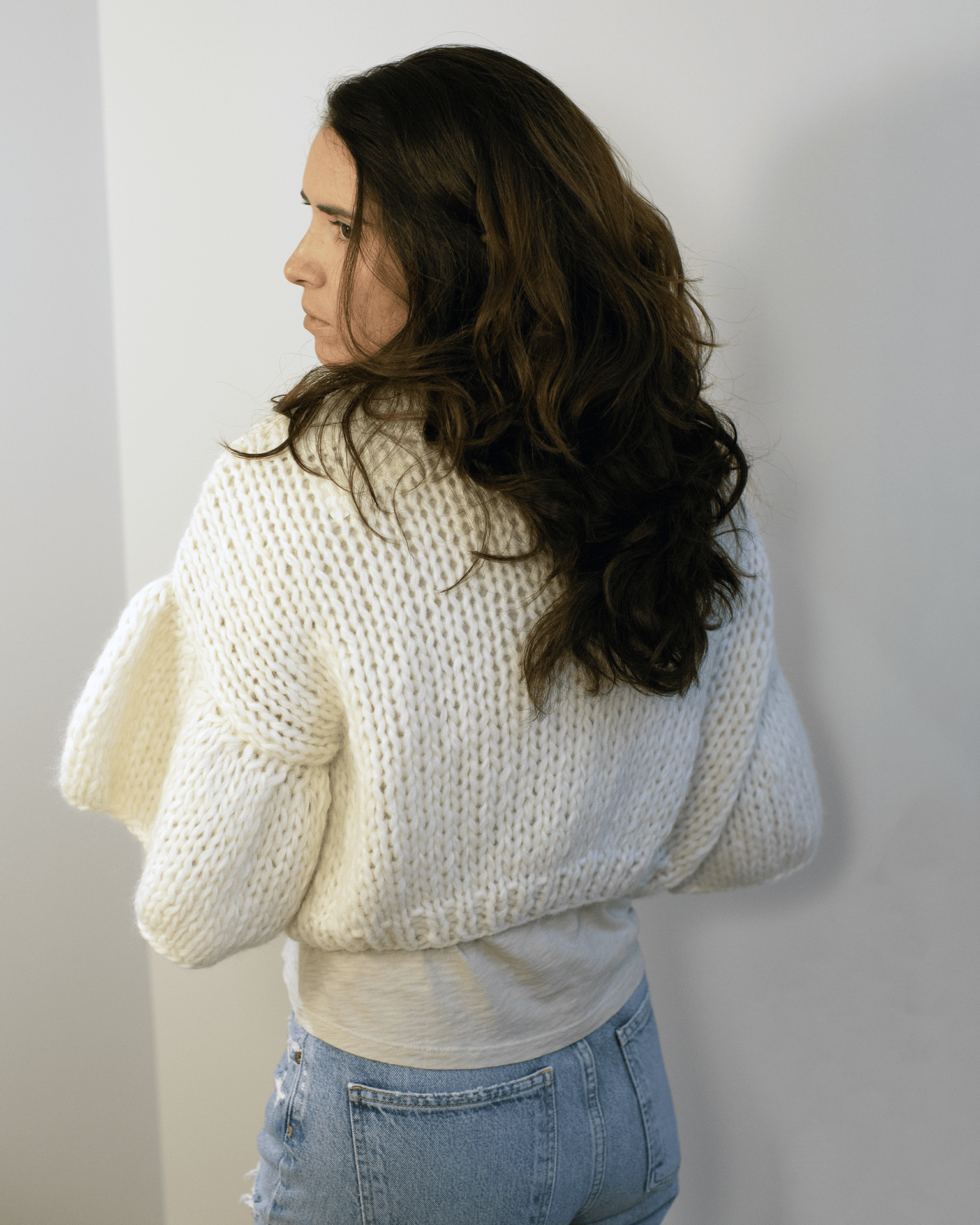 Chunky Alpaca Ruffled Short Cardigan in Creme