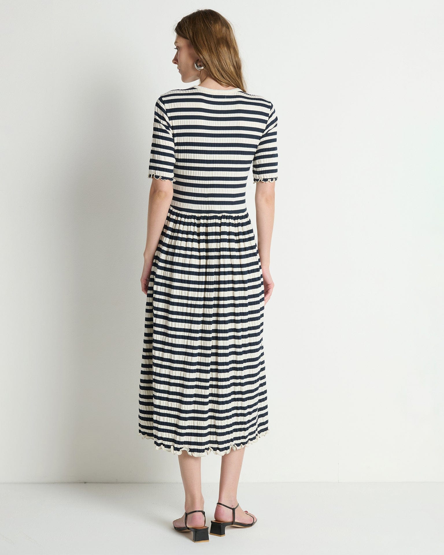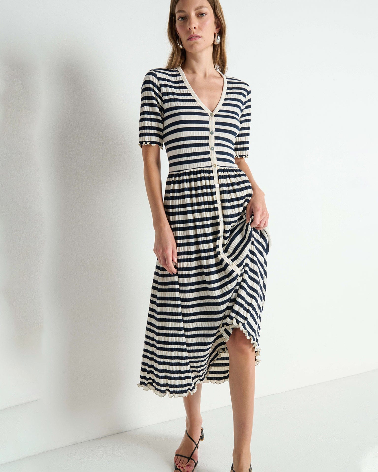 The Claudine Midi Dress from Nation brings Mediterranean ease to the everyday with its form-fitting silhouette in textured jacquard crinkle jersey. It's v neckline, full button down front placket, shell buttons and a ruffled hem keeps it casually refined.