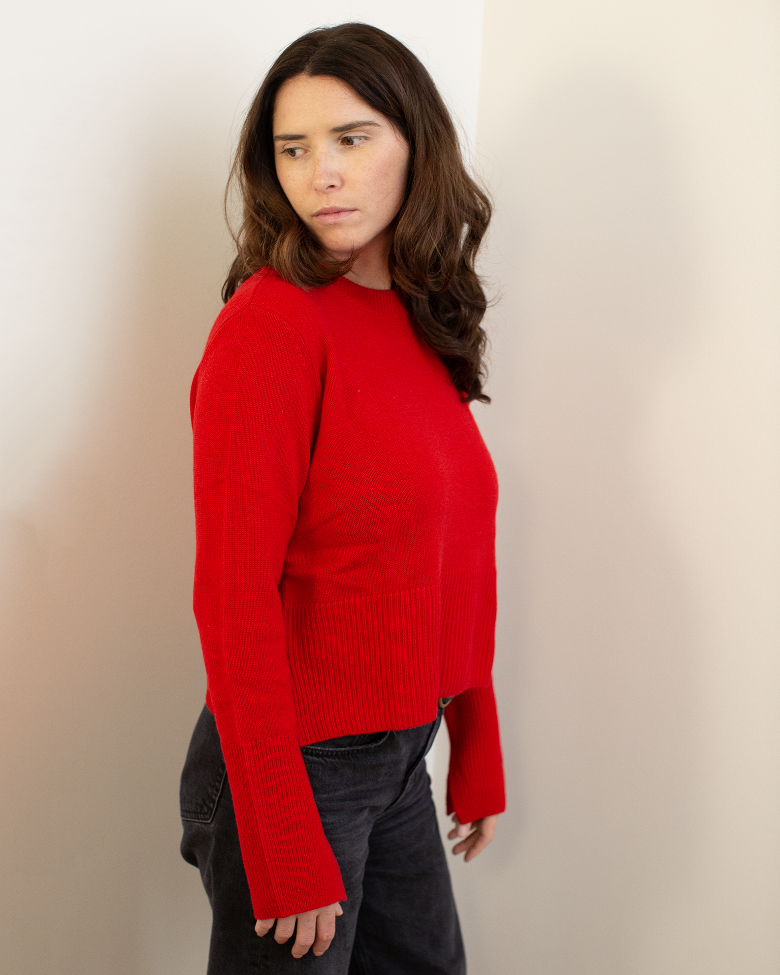 This new pullover from Autumn Cashmere adds a warm pop of color to your cold weather wardrobe. It features a cropped, boxy silhouette with side slits for gentle movement. Contrast rib knit at the edges add some texture and slit details at the cuffs add extra warmth and intrigue. It's an easy crewneck to layer under your favorite denim jackets.