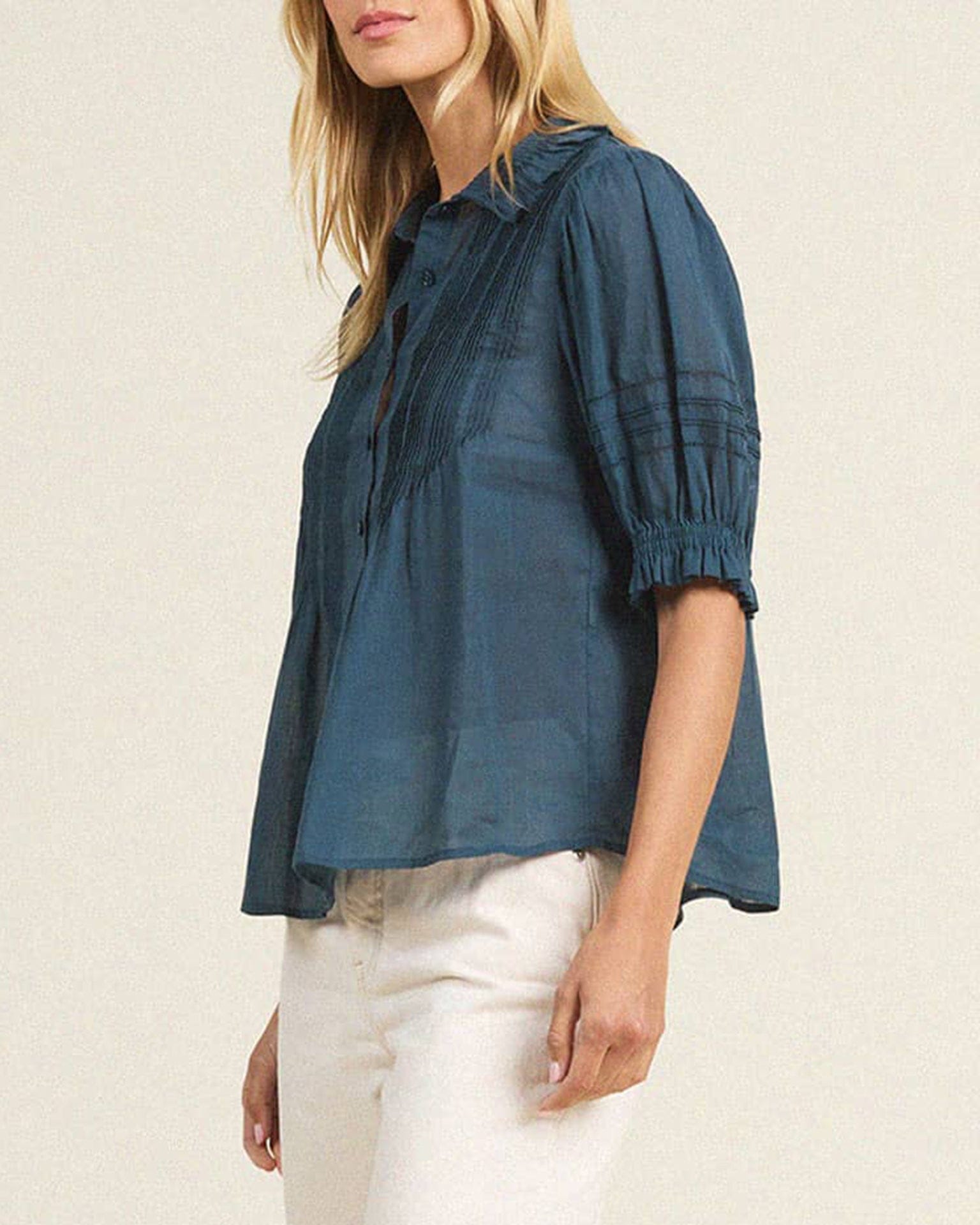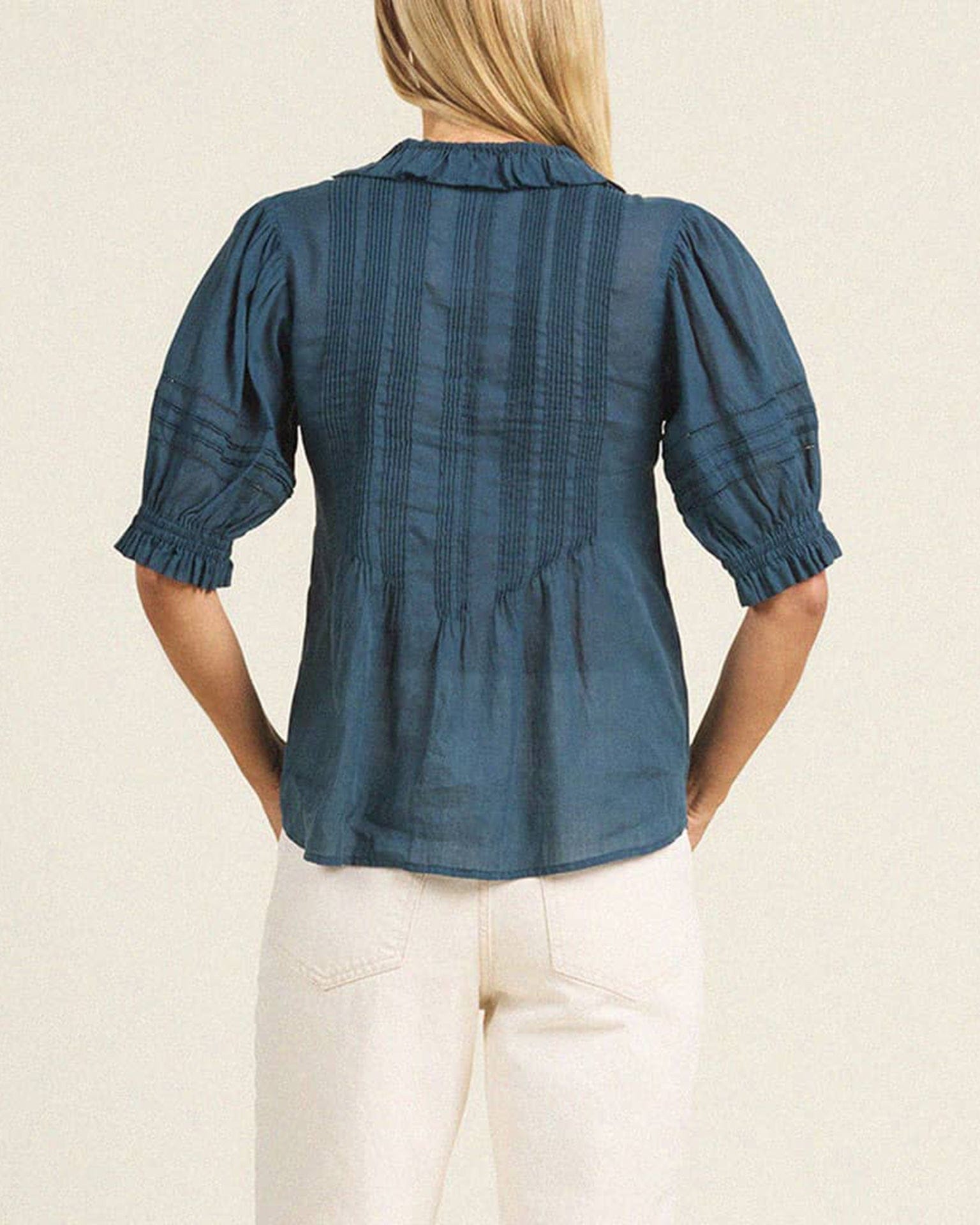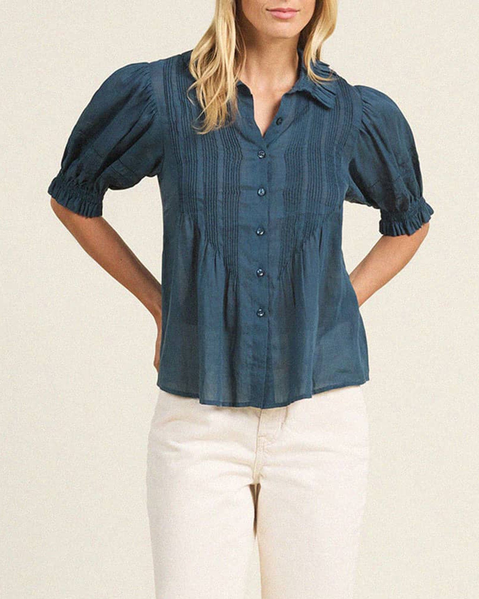 The Jess Blouse is a swingy, cropped silhouette from Trovata. A flat collar, ruffle detailing on the sleeves and pintucking down the front body all add feminine touches to the classic button down. Pair it with linen trousers or your favorite denim for an easy, elevated look.