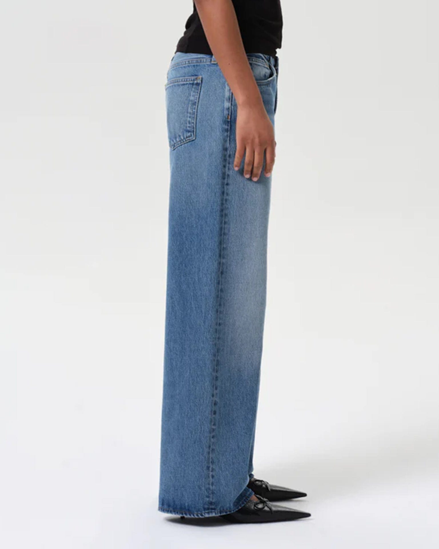 The Keira Jean from AGOLDE is a relaxed, low-rise silhouette with an exaggerated full-length wide leg. Crafted from rigid regenerative cotton denim, this clean rinse wash offers a refined, structured look—perfect for pairing with a fitted tank or tucked-in shirt.
