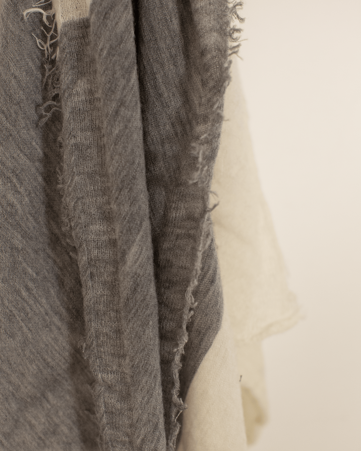 Grisal scarves are knit slowly on vintage machines from the softest, most luxurious yarns. No two scarves are alike, each scarf is knit on the bias and has fringe along the edges. This navy and heather grey color block scarf is as versatile as it is luxurious!