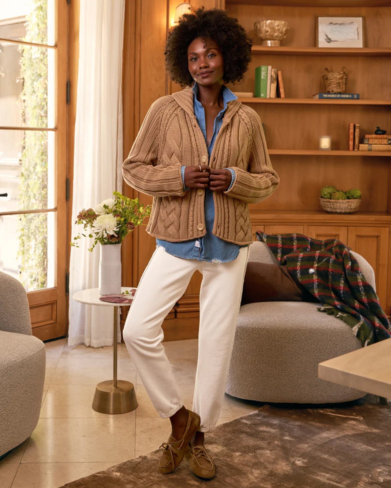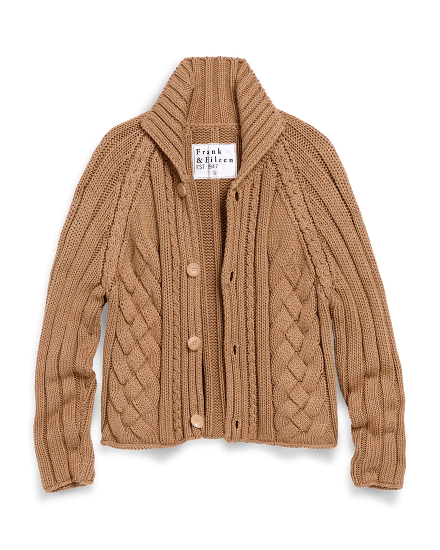This cropped cable knit cardigan from Frank & Eileen comes in luxuriously soft Pure Italian Cotton and features all the signatures of the original: richly textured braided patterns, elegant horn buttons, and an exaggerated cozy collar. It's a versatile cropped fit that's made shows off your layers!