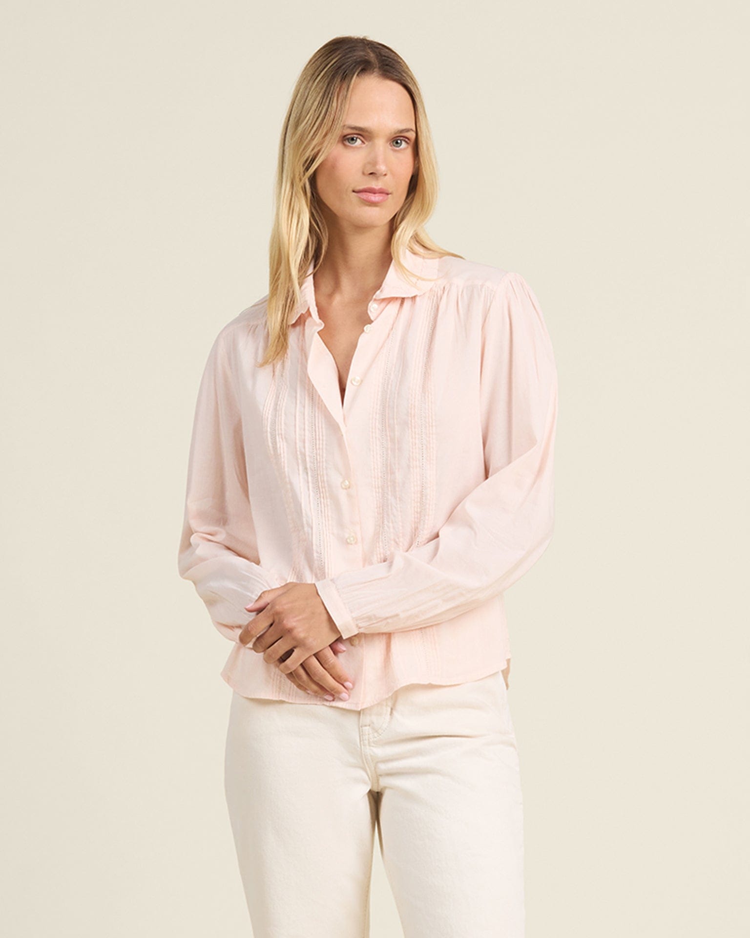 The Thalia Blouse is a new silhouette from Trovata that has a ruffled collar, pintuck detailing down the front body, and bracelet-length sleeves. The body makes for an easy to wear untucked or tucked look, and it's finished with antique white buttons for a perfectly polished feel.