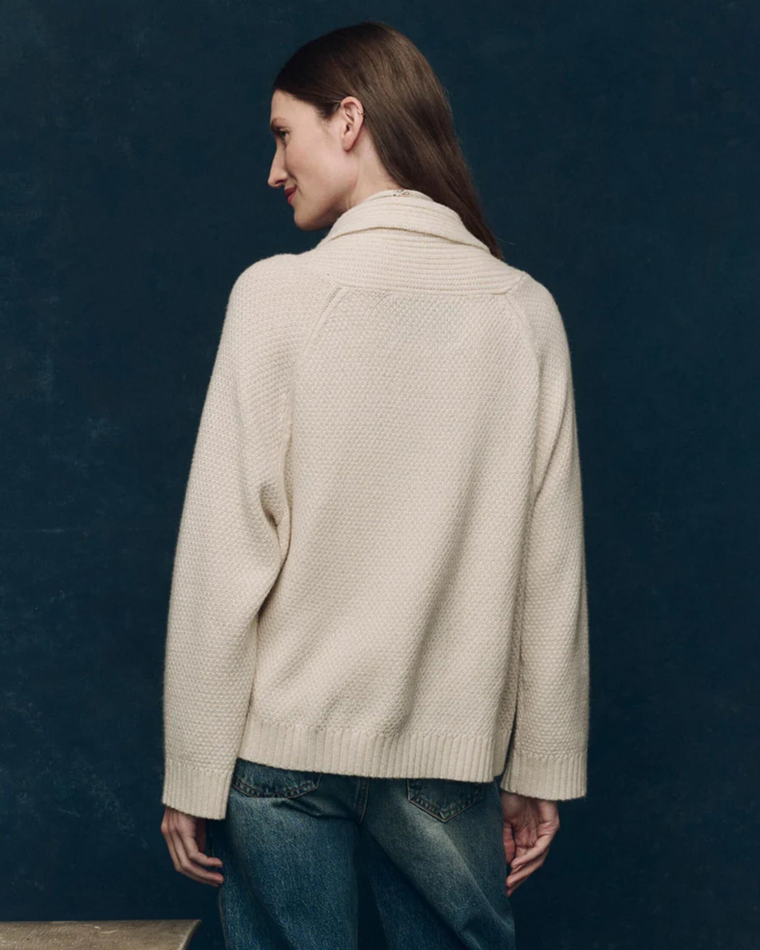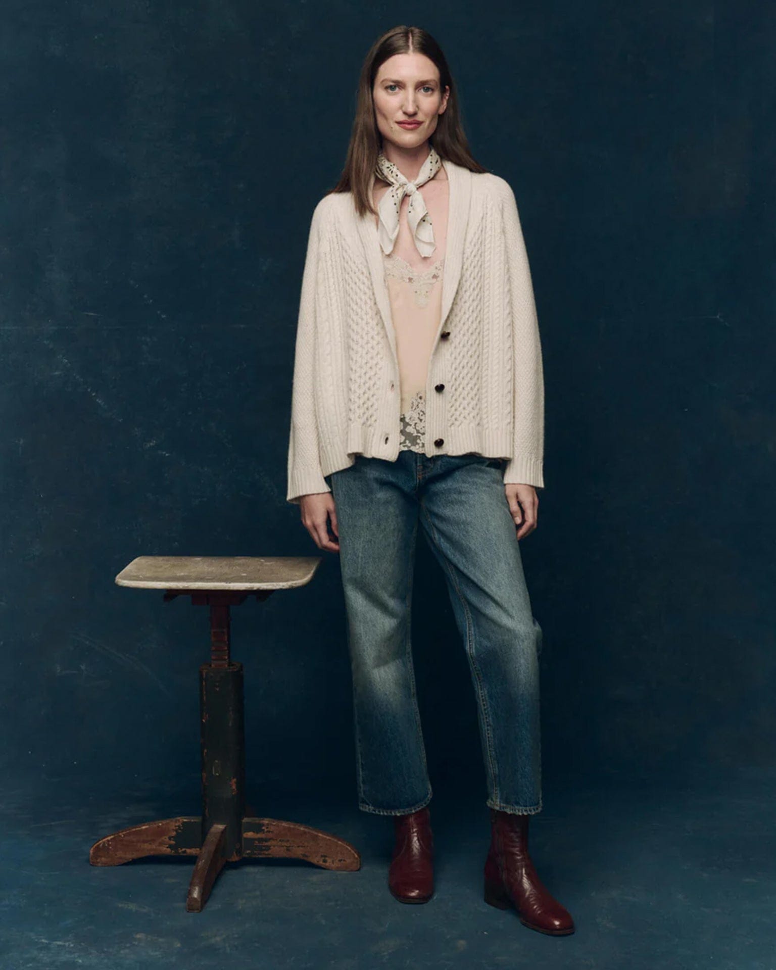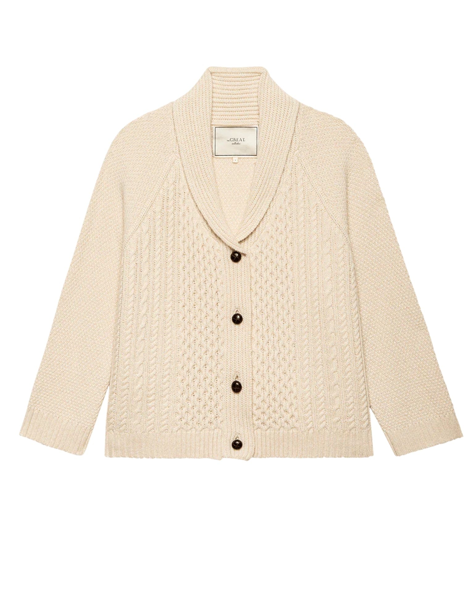 Spun from 100% cashmere in a traditional cable stitch, The Cashmere Cable Lodge Cardigan from the GREAT. is a warm and textural layer with a relaxed shape. It features raglan sleeves, a shawl collar, and real leather buttons. Soft yet substantial, this version is slightly slouchier than our original Lodge silhouette—easy to pack, easy to wear, day after day.