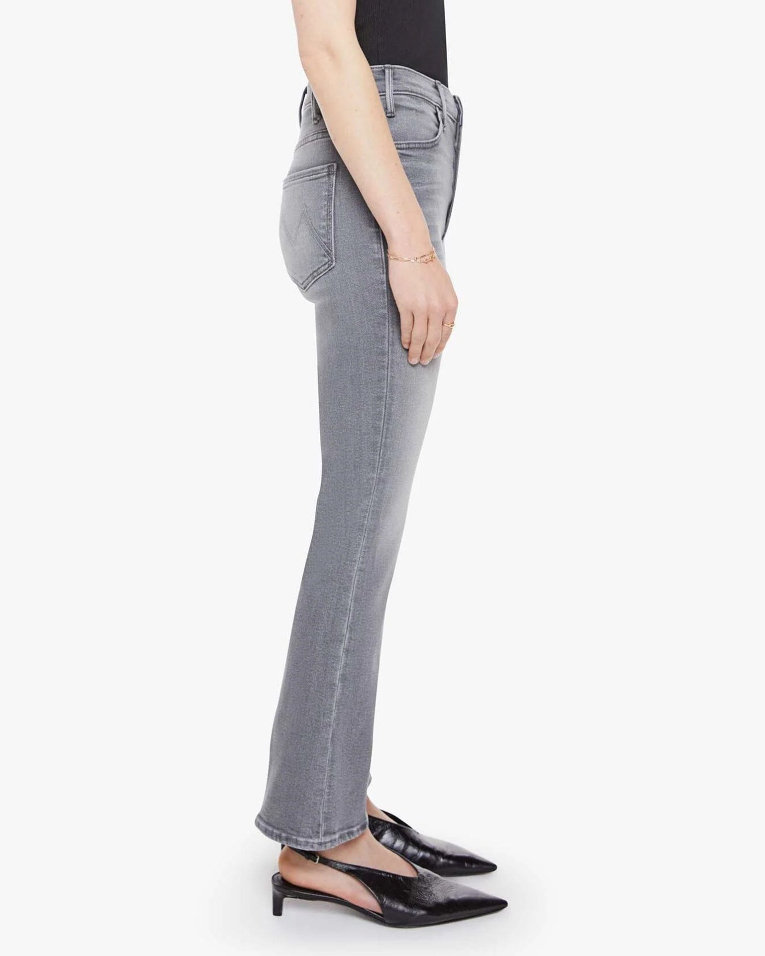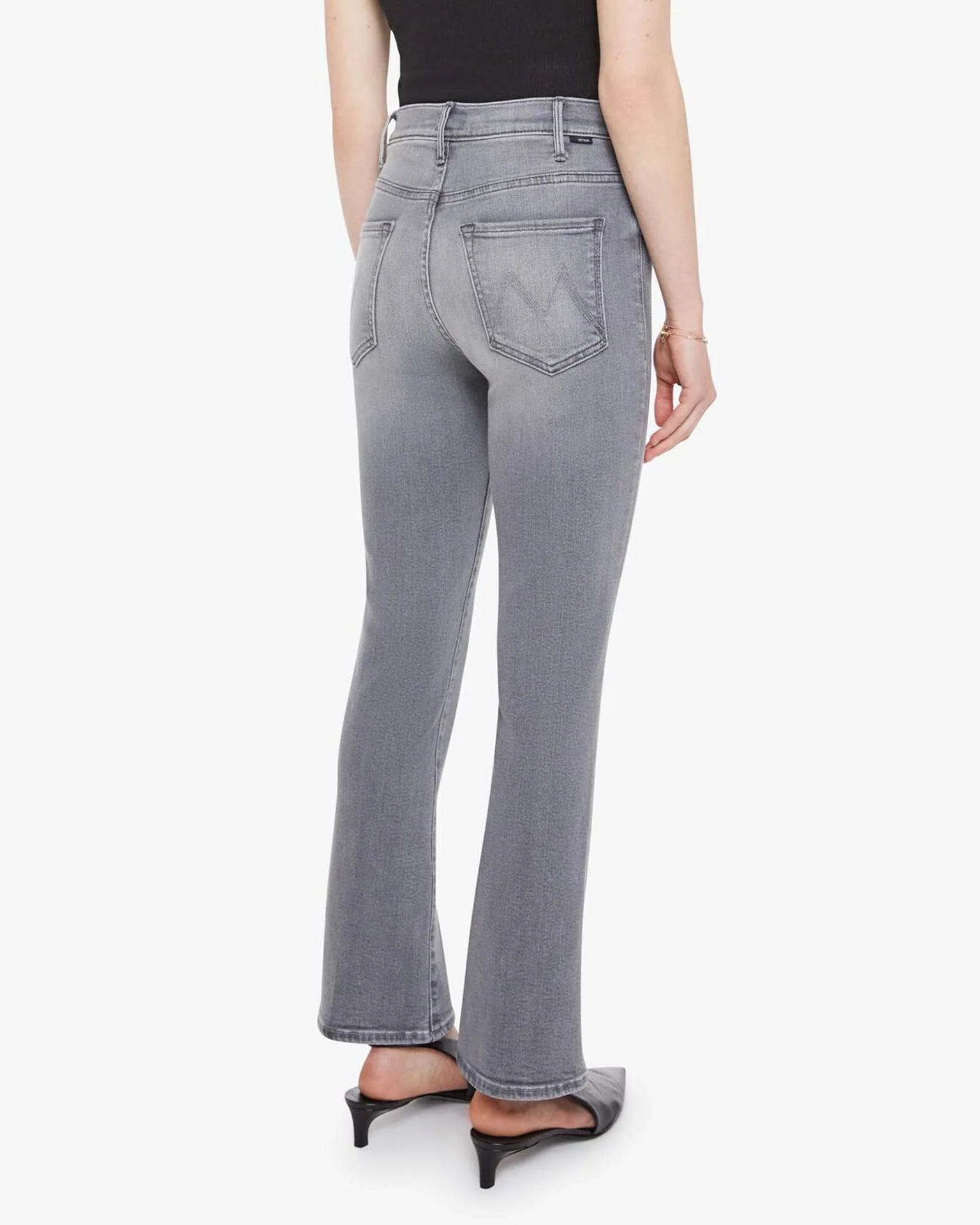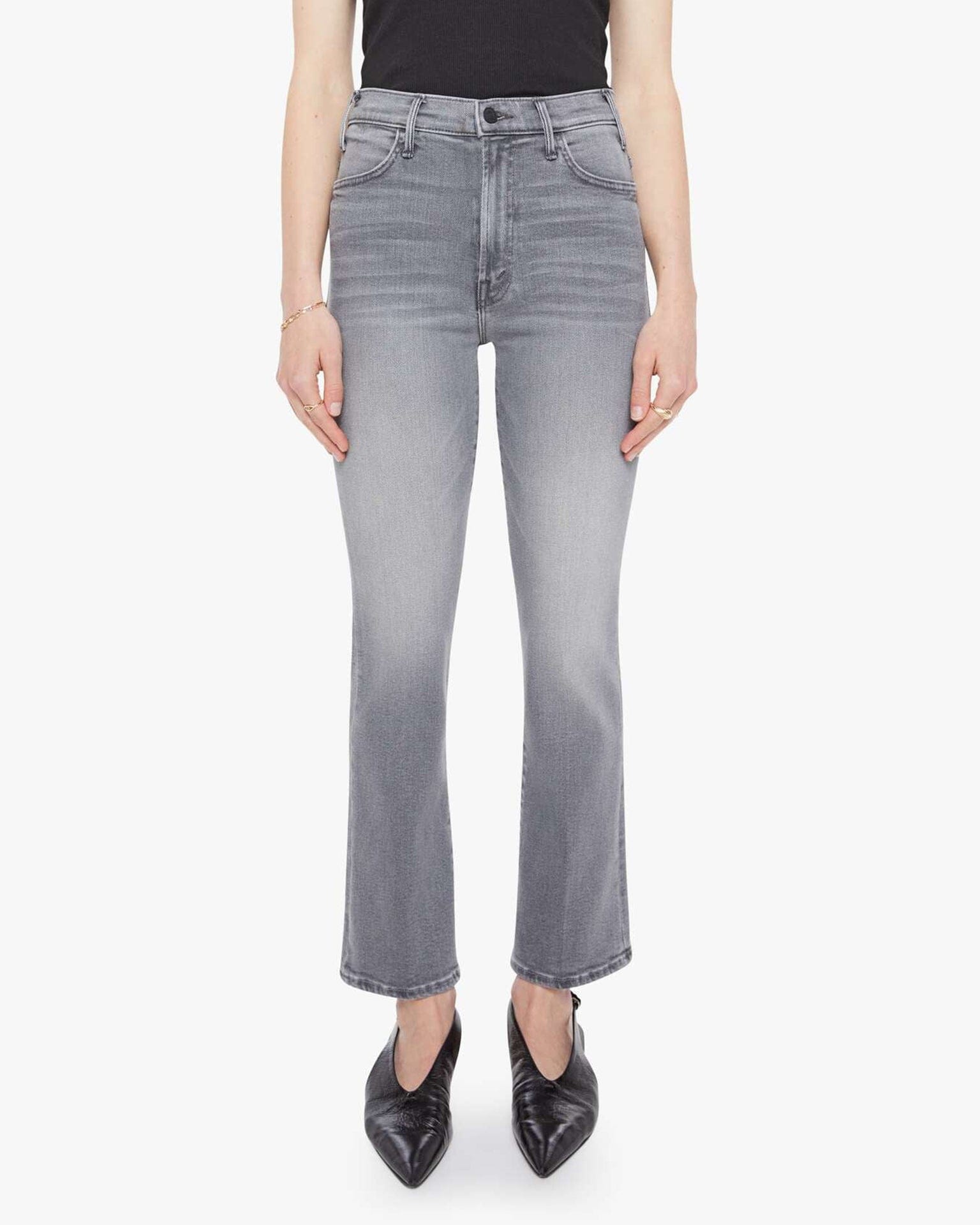 MOTHER's bestselling high-rise flare has a zip fly, ankle-length inseam and a clean hem. Made from stretch denim, The Hustler Ankle in Escape Goat is a light grey with whiskering, fading and black hardware.