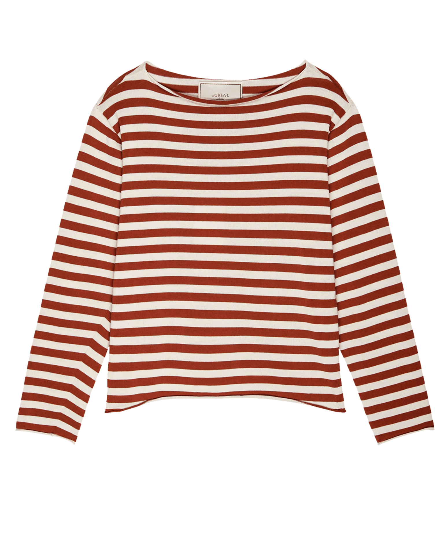 Inspired by a 19th-century nautical uniform, The Sailor Sweater from the GREAT. is spun from lightweight cotton yarn. It features a boxy, relaxed fit, wide raw edge boatneck, two-color horizontal stripes, and a longer length. Perfectly slouchy, roll the sleeves and tuck it into your favorite jeans.
