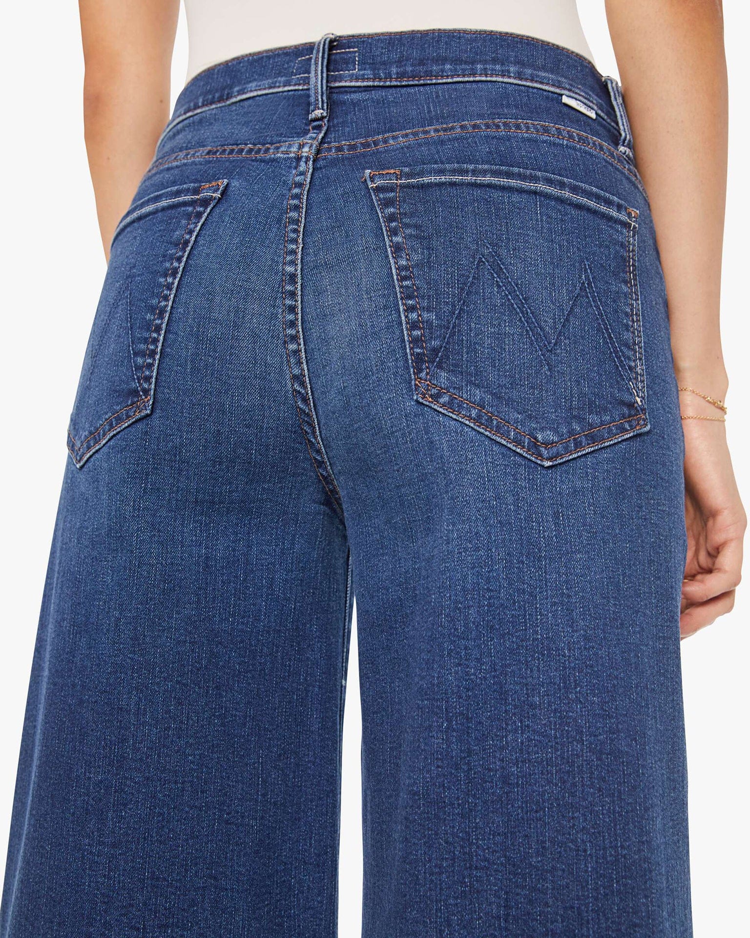The Undercover from MOTHER is a new wide leg silhouette that features a high rise, zip fly and a 33-inch inseam with a clean hem. Made from a blend of recycled stretch denim, Start Your Engines is a dark blue with whiskering and fading at the knees.
